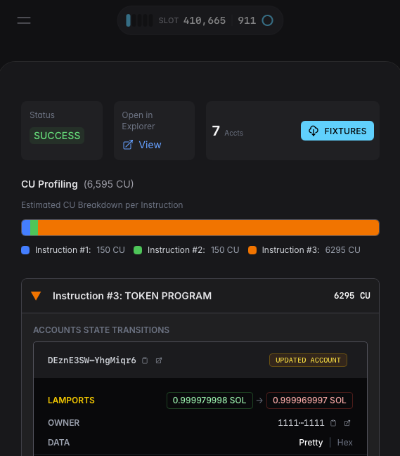 Surfpool Studio provides a level of detail unparalleled in Solana development. Inspect bytes before and after transactions, profile compute units, and debug at the instruction level.